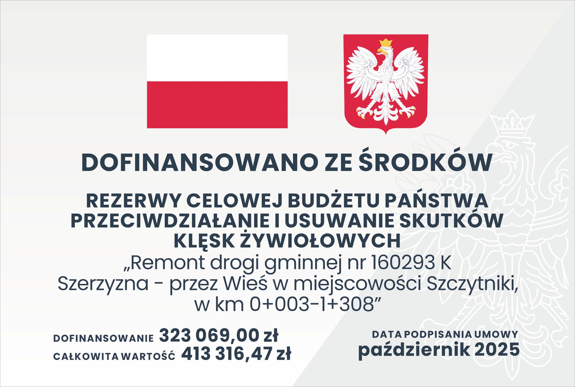- "Remont drogi gminnej 160293K Szerzyzna-Przez Wieś w miejscowości Szczytniki" - dofinansowanie w wysokości 444 300 zł