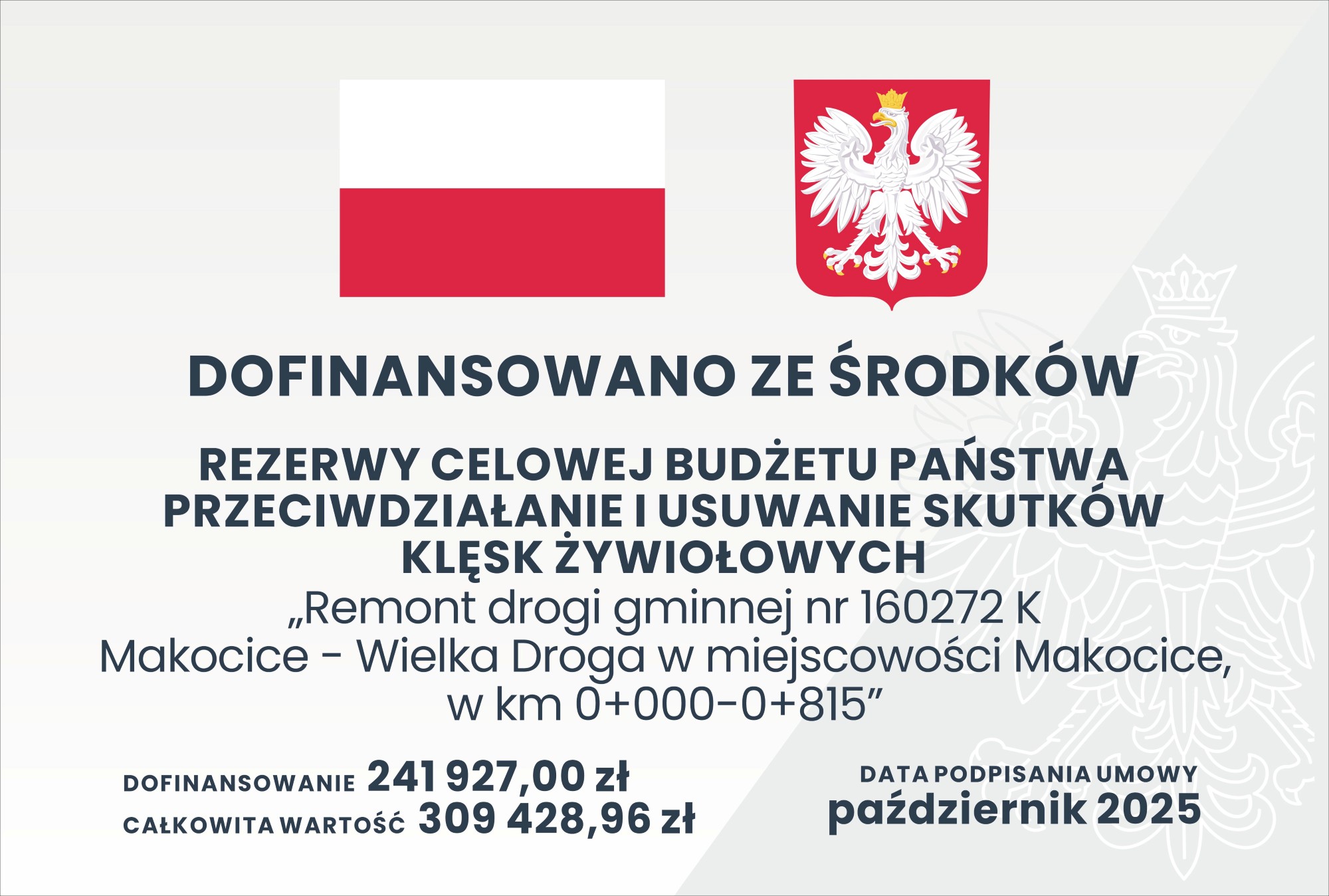 - "Remont drogi gminnej 160272K Makocice-Wielka Droga w miejscowości Makocice" - dofinansowanie w wysokości 292 200 zł