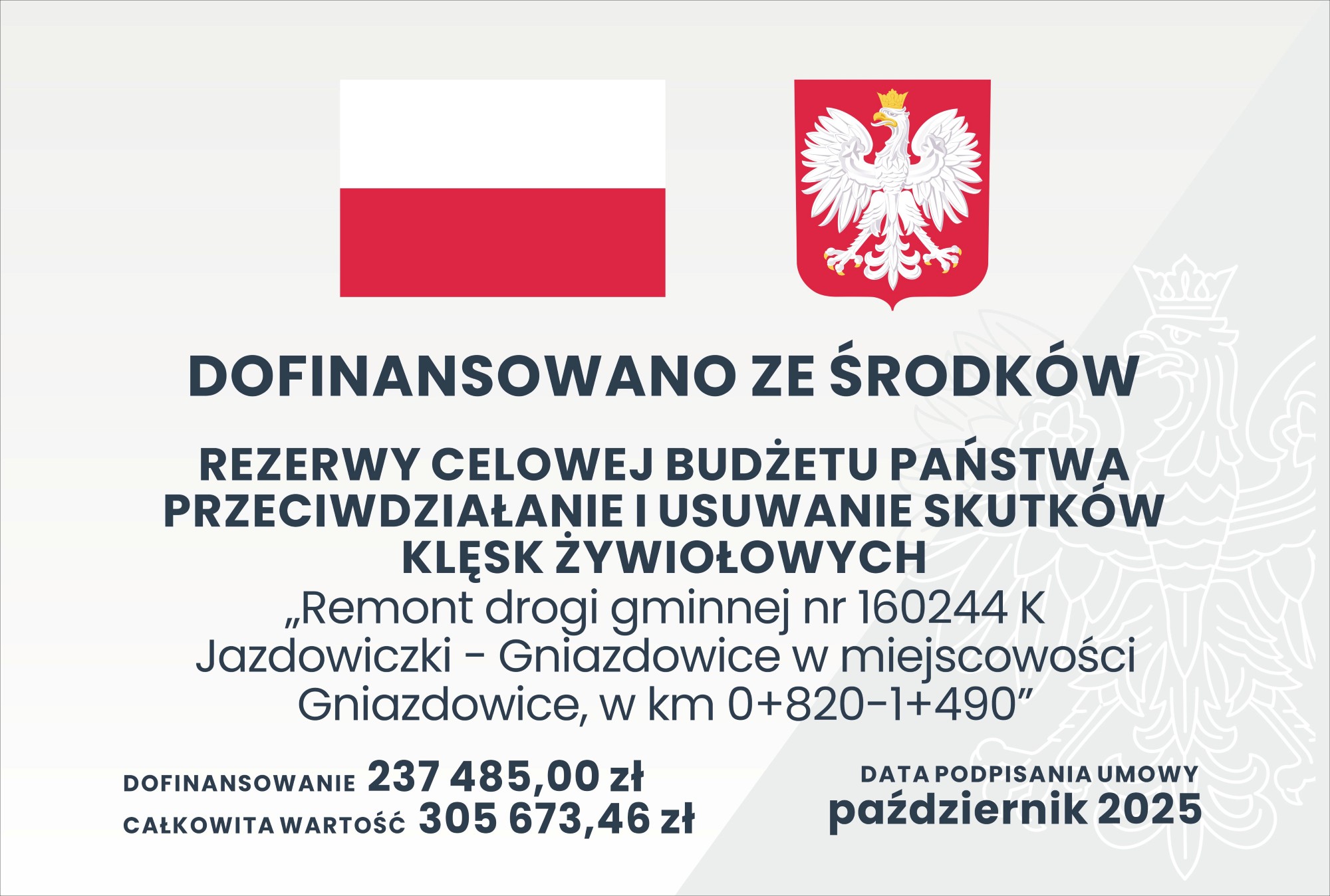 - "Remont drogi gminnej 160244K Jazdowiczki-Gniazdowice w miejscowości Gniazdowice" - dofinansowanie w wysokości 320 000 zł